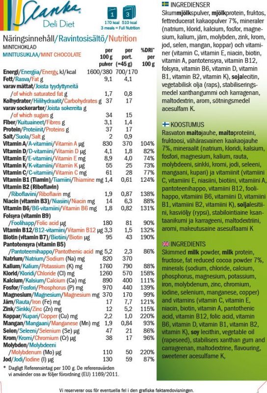 *On the VLCD diet you must eat all 3 portions per day to get all the necessary nutrients. Drink about 3 litres of water/day. Slanka should not be used as the sole food source for more than 3 weeks without consulting a doctor.
